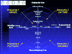 The RCM can be visualized as a series of 4 concentric rings, or dimensions; Document Creation, Records Capture, The Organization of Corporate and Personal Memory and The Pluralization of Collective Memory intersecting with a set of crossed axes; transactionality, evidentiality, recordkeeping and identity.[2] Each axis is labelled with a description of the activity or interaction that occurs at that intersection. Create, Capture, Organize and Pluralize, as the dimensions are referred to in short, represent recordkeeping activities that occur within spacetime. Activities that occur in these dimensions across the axes are explained in the table below:[1][7]