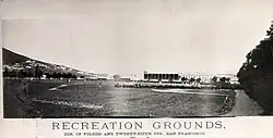 Recreation Grounds, opened on November 26, 1868, and operated until May 1884, and was San Francisco's first professional enclosed ballpark. Located at the terminus of a railcar line in San Francisco's heavily Irish Mission District, at the present day Garfield Square.[1][2] The ballpark was bordered by the streets Harrison, Twenty-Sixth, Folsom and Twenty-Fifth.[3] The opening day ceremonies included the second game of the California baseball championship series between the Oakland Wide Awakes and the San Francisco Eagles, who won by the score of 37–23. The day's festivities included an operatic concert and footraces and were attended by a crowd of 4,000 people.[4] Photo.