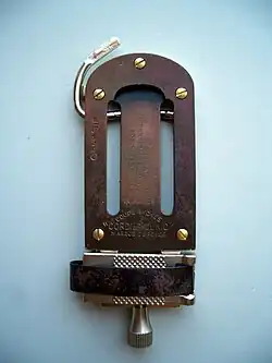 A typical design involves fastening the reed onto the tripper by using a flexible strip of steel, and adjusting the height of the reed by using a knurled knob. Once the reed is positioned at the desired height, a small lever is pulled, which clips off a sliver of material from the tip. There is often a strap to secure the clipper in place.[2]