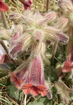 Rehmannia glutinosa is a flowering broomrape, and one of the 50 fundamental herbs used in traditional Chinese medicine, where it has the name shēng dì huáng (Chinese: 生地黄). It is often sold as gān dì huáng (Chinese: 干地黄), gān meaning "dried". Unlike the majority of broomrapes, R. glutinosa is not parasitic, and is capable of independent photosynthesis.