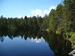 Rejvíz is also name of a national nature reserve, which was established in 1955 and covers 328.6 ha (812 acres).[2] It is composed of the largest peat bog in Moravia and Czech Silesia with small lakes of glacial origin. Recent studies have found the Rejvíz bog to be one of the best preserved woody raised bog complexes in Central Europe as core sampling reveals its organic deposit started to accumulate nine thousands years ago or even earlier.[3] An educational trail was opened in 1970 and leads from the Rejvíz Guesthouse to Velké mechové Lake in the western part of the nature reserve. It is 1.5 km long and there are six stops with information boards.