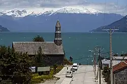Reloncaví Estuary with Yate Volcano in the background and the town of Cochamó in the foreground.