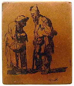His technique as an aquafortist developed “considerably”: he abandoned the meticulous treatment of textures so dear to him – as seen in Le Persan (B. 152) or La Liseuse (B. 345) – to concentrate on the structure of objects and lighting effects, as in Mendiants recevant l'aumône à la porte d'une maison (B. 176). He also made greater use of drypoint; La Pièce aux cent florins (1649) represents "all the aspirations, if not all the achievements of an entire decade", thanks to the harmony achieved by exploiting different techniques.[11]