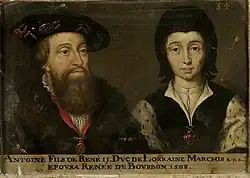 Renée was brought up with her cousins, the princesses of France. On 26 June 1515 she married Antoine, Duke of Lorraine in Amboise.[1] The marriage was arranged by the French King, Francis. Francis had promised Antoine marriage to the French queen dowager, Mary Tudor of England, but when Mary chose another spouse, Francis replaced her with Renée.