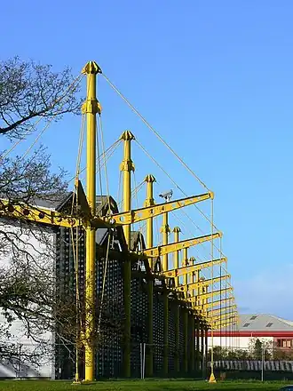 The architecture expressed not only the corporate ownership, through the yellow of Renault used on all the structural elements, but also promoted a modern statement on industrial relations by using the same roof over the warehouse and offices, making no distinction between white- and blue-collar workers.[5] The cable-stayed steel structural system provides a 24m column clear zone, with the columns being of only 450mm diameter.