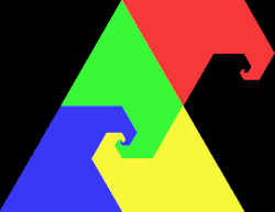 Rep-tiles can be used to create fractals, or shapes that are self-similar at smaller and smaller scales. A rep-tile fractal is formed by subdividing the rep-tile, removing one or more copies of the subdivided shape, and then continuing recursively. For instance, the Sierpinski carpet is formed in this way from a rep-tiling of a square into 27 smaller squares, and the Sierpinski triangle is formed from a rep-tiling of an equilateral triangle into four smaller triangles. When one sub-copy is discarded, a rep-4 L-triomino can be used to create four fractals, two of which are identical except for orientation.