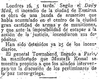On 17 September, when the massacre and the fire in the city had come to an end, Mustafa Kemal Atatürk, future Turkish President and then-Commander-in-Chief of the Turkish armies, sent the Minister of Foreign Affairs Yusuf Kemal the following telegram, describing the official version of events in the city:[27][28]