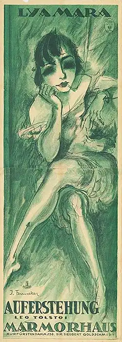 Resurrection (German: Auferstehung or Katjuscha Maslowa) is a 1923 German silent drama film directed by Frederic Zelnik and starring Lya Mara, Rudolf Forster and Lydia Potechina.[1] It premiered at the Marmorhaus in Berlin.