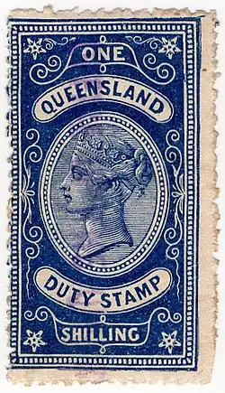 The Australian state of Queensland issued revenue stamps from 1866 to 1988. There were various types for different taxes.[1]