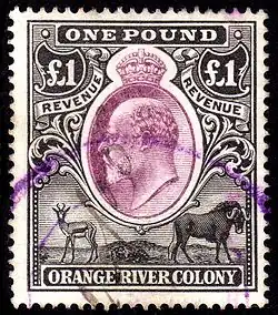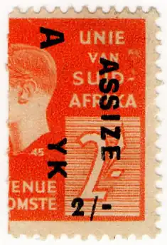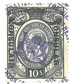 The first general purpose South African revenue issue was in 1913. From that year until 1937, all South African revenues featured the profile of King George V, with changes in size and inscriptions. From 1938 to 1952 stamps featured King George VI. The original 1938 issue was reissued in bantam format in 1943, and in 1946 these were replaced by a new design still featuring the King. In 1942, Native Tax stamps were overprinted REVENUE or INKOMSTE. 1954 saw a new design featuring Queen Elizabeth II, but these were quickly replaced by an issue bearing the coat of arms later that year. These were used reissued denominated in rand in 1961, and were replaced by a numeral issue in 1968. These remained in use until a new design, also a numeral, appeared in 1978. These were finally withdrawn in March 2009.[2]