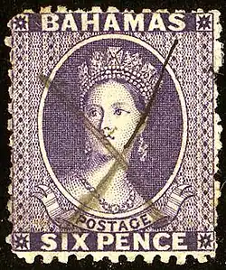 Very few revenue stamps of the Bahamas have been issued, as most of the time dual-purpose postage and revenue stamps were used for fiscal purposes. They were used as such from around the 1860s to at least the 1950s. A couple of revenue-only impressed duty stamps embossed in vermilion ink are known used in the 1950s. Similar stamps but with colourless embossing might also exist.[1]