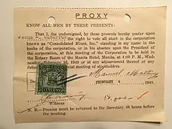 A 1947 Republic of the Philippines Documentary Revenue 50 Centavos used on a 1949 Proxy document.[1]