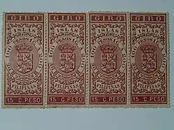 1897 Spanish Philippines 15 centimos GIRO revenue stamps.[3]