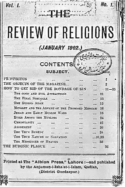 The Review of Religions was established by Mirza Ghulam Ahmad in 1902 with the express purpose of disseminating Islamic teachings in the English language. The periodical had three main goals: to inspire new Muslim converts in the Western world who may have felt isolated and reinvigorate their efforts in propagating Islam; to convey a clear understanding of Islam to non-Muslim intellectuals; and to counteract Christian missionary proselytism.[5] The idea that the Review should publish more articles of a general nature with those specifically connected to the Ahmadiyya movement being printed in a supplement was abandoned early on at Ghulam Ahmad's behest.[6] The Review targeted Western audiences and focused especially on Christianity.[7][8] The magazine was printed in Lahore but published from Qadian, Punjab, alongside an Urdu edition.[9]