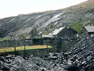 The tramway remained in operation over its full length for close to a century. The section between Cwt y Bugail and Rhiwbach was lifted in 1956 and the section from Cwt y Bugail to Maenofferen was closed in 1961 and lifted in 1964.[3] The first incline was replaced by a road, but a short section remained in use between the mills at Maenofferen and the foot of No 2 Incline, which became the last remaining gravity incline in the North Wales slate industry. This section was finally closed in 1976 after a new quarry road was built connecting the upper levels of Llechwedd with the mills at Maenofferen.[4] Most of the track was lifted, although short sections of track remained intact as late as 2013.