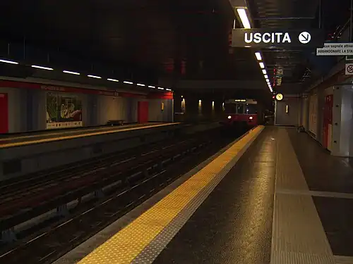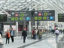 Rho Fiera is a station on Line 1 of the Milan Metro in Rho, Lombardy, Italy. It was opened on 14 September 2005 as a one-station extension from Molino Dorino; Pero station was only added on 19 December 2005.[2] The station provides service to the FieraMilano exhibitition centre and is the current western terminus of the line. It is the westernmost station on the network. The station is outside the urban area of Milan. There is a special ticket, single or return, available for people travelling from Milan in order to visit the exhibitition centre by way of Rho Fiera station.[3]