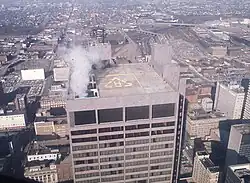 The building is topped with radio and television antennae, installed during the building's construction. The initial antennae were for the Columbus Division of Police, Columbus Division of Fire, and the Ohio Educational Television network (the latter was supported by a large circular steel structure).[20] Also at the top of the building are air navigation beacons as well as a rooftop helicopter pad (for official and emergency use only).[11]