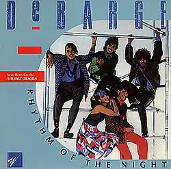 The release of "Rhythm of the Night" coincided with the release of the Motown film The Last Dragon, which featured the song as part of its soundtrack. The free publicity from the song's association with the movie helped boost its popularity. Eventually released as a single, the song produced DeBarge's biggest success yet, with the single reaching number three on the Billboard Hot 100, number one on Hot R&B/Hip-Hop Songs,[3] number one on the US adult contemporary chart, and number four in the UK—their only major hit single in the UK—going gold and boosting similar success for its parent album of the same name. The music video gained the group heavy rotation on MTV and BET and was actually the group's first (and last) real music video, starting a brief period where DeBarge became pop superstars. The song featured in the 2016 film Ghostbusters: Answer the Call and a cover version appeared in the jukebox musical Moulin Rouge!.[4] The song also features in the twelfth season of RuPaul's Drag Race as a running gag, due to contestant Crystal Methyd's out-of-drag resemblance to El DeBarge. Lyrics and sample from the chorus of "Rhythm of the Night" were adopted in CNCO's song "Pretend".