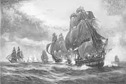 In September 1797, Byron joined HMS Doris then the following month he joined La Virginie, as flag-lieutenant to Hugh Christian, and in her sailed to the Cape of Good Hope.[1] On 22 June 1798, Byron was given his first command, the brig, HMS Cornwallis but he held this position for less than a month. He did not find employment again until 12 August 1801, when he was appointed to the 18-gun Rosario, a French prize. In her he sailed to the West Indies where he served on the Jamaica station.[1] Byron made Post-captain in August 1802 and in October the following year was due to command Inconstant, but after she was fitted out, his commission was revoked and he didn't command again until he received command of the 36-gun Belvidera in February 1810, and fought in the Battle of Silda, 23 July.[1] It was while in command of Belvidera that Byron became involved in one of the first conflicts of the 1812 Anglo-American war.[15]