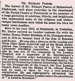 - ^ a b "Mr. Richard Foster". The Times (39467): 9. 28 December 1910. ISSN 0140-0460. Wikidata Q119585824.