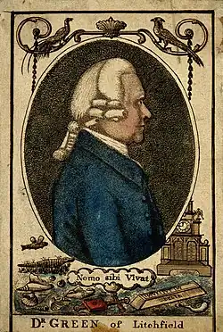 Greene was the first to establish a printing press at Lichfield, and from about 1748 until his death his zeal in collecting objects of interest never flagged. He deposited these curiosities in the ancient registry office of the bishops of that see, which stood nearly opposite the south door of the cathedral, and has long since been pulled down. A view of one side of the room of this museum, sent by the Rev. Henry White of Lichfield, appeared in the 'Gentleman's Magazine' for 1788, pt. ii. 847, and was reproduced in Stebbing Shaw's History of Staffordshire. The fame of his collections spread far and wide, and the building was open gratuitously on every day except Sundays. After a life entirely spent in the city of his birth he died there on 4 June 1793, aged 77. His first wife was named Dawson, and by her he had one daughter, who married William Wright of Lichfield. His second wife was Theodosia Webb of Croxall in Derbyshire, who died at Lichfield on 1 August 1793; she had one son, Thomas, a lieutenant and surgeon in the Stafford militia. Greene's portrait, with the motto, described by Boswell "truly characteristical of his disposition, Nemo sibi vivat", was engraved in his lifetime, and is inserted in Shaw's 'Staffordshire,' i. 308. A token still exists of him, and is described in 'Notes and Queries,' 1st ser. i. 167, 1850. On one side is represented his bust, with the words 'Richard Greene, collector of the Lichfield Museum, died 4 June 1793, aged 77;' on the other appears a Gothic window, lettered 'west porch of Lichfield Cathedral,' 1800.