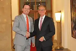 Grenell presented his credentials to the president of Germany on May 8, 2018.[43] Within hours of taking office, Grenell offended German diplomats and business leaders when he tweeted that "German companies doing business in Iran should wind down operations immediately".[44] The tweet was widely perceived as a threat, with the Foreign Minister of Luxembourg, Jean Asselborn, commenting that "This man was accredited as ambassador only yesterday. To give German businesses such orders (…) that is just not how you can treat your allies".[45] The leader of Germany's Social Democratic Party said that Grenell "does appear to need some tutoring" in the "fine art of diplomacy", while the Left Party urged the Merkel government to summon Grenell to explain his comments.[45]