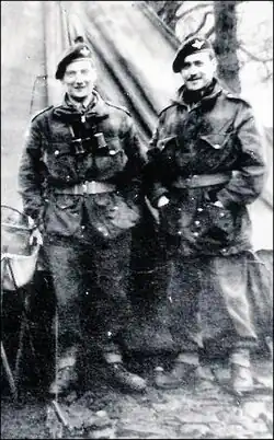 He was commissioned into the 2nd/4th Battalion of the King's Own Yorkshire Light Infantry (KOYLI). Following arctic warfare training in Iceland he returned to the UK as a lieutenant (having been promoted to that rank on 1 October 1942).[5] For a short while he was posted, at his request, as liaison officer to the 42nd Armoured Division then applied to join the Parachute Regiment to have a better chance at seeing action. He was accepted and after training was posted to the 7th (Light Infantry) Parachute Battalion, which formed part of the 5th Parachute Brigade of the 6th Airborne Division, commanded by Major General Richard Gale. On 6 June 1944, he participated in Operation Tonga during the D-Day landings.[6] He was among the first British soldiers to land in Normandy and the first Irishman.[1][7] His battalion parachuted after glider-borne forces had landed to capture the Pegasus Bridge near Caen.[6] During the operation he met Major John Howard on the bridge and was involved in helping to repulse counter-attacks by the German forces in the area. Five days after D-Day, while still in the bridge defence area, he was promoted to captain.[8][5] Todd later played Howard in the 1962 film The Longest Day, recreating these events.[9]