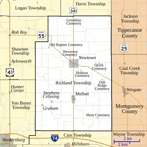 According to the 2010 census, the township has a total area of 51.94 square miles (134.5 km2), all land.[3] It contains two incorporated towns: Newtown, with a population of about 250, lies near the center of the township; Mellott, with about 200 people, is about 2 miles (3.2 km) south. Indiana State Road 341 passes through both towns;[4] Indiana State Road 55 intersects State Road 341 in Newtown.[5] The two unincorporated communities of Graham and Stephens Crossing both lie to the southwest of Newtown along the route of a former railroad which came out of Veedersburg and also passed through Mellott and continued east.