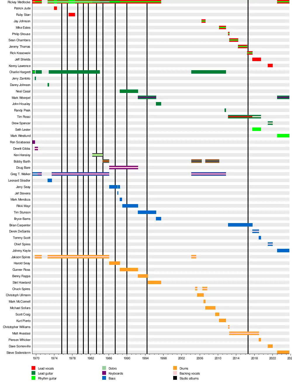 Since the new lineup's first appearance in 2012, there have been constant shuffles in personnel. And since 2023, Medlocke has been making it a point to appear at more of the band's concerts, alongside former 90s member Mark Woerpel.[9]