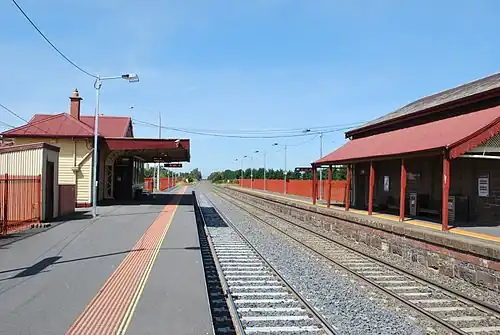 As part of the Regional Fast Rail project in 2005, the station received a refurbishment, including new platform facings and new fencing.[3] In 2010, the goods shed was refurbished into a waiting room and ticket office.[3] In January 2014, the platforms were extended to accommodate longer trains.[6]