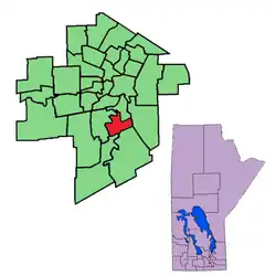 Riel is a provincial electoral division or riding in the Canadian province of Manitoba. It was created by redistribution in 1968, and has formally existed since the provincial election of 1969. The riding is in the south-central region of Winnipeg, Manitoba's capital and largest city, and is named after Louis Riel, the leader of the 1870 Red River Rebellion.