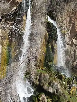 Rifle Falls State Park is a Colorado State Park located in Garfield County northeast of Rifle, Colorado. The central feature of the 48-acre (19-hectare) park is Rifle Falls,[2] a triple 70-foot (21-meter) waterfall flowing over a travertine dam on East Rifle Creek. Commonly seen wildlife includes mule deer, elk, coyote, and golden-mantled ground squirrel. Rainbow and brown trout can be caught in the creek. Limestone cliffs near the falls have a few small caves and three species of bats. Visitor facilities include campsites, picnic sites and 2.0 miles (3.2 kilometers) of hiking trails.
