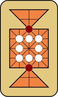 2. Nine orang pieces are initially placed on the nine intersection points of the central square of the alquerque board, leaving 26 nodes unoccupied.