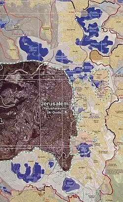 8. ^ A Palestinian Academic Society for the Study of International Affairs study notes (citing from another analysis) that "'since 1967, two rings of new residential neighborhoods built around the city center have created new ramparts [emphasis original] designed primarily as a political barrier against any possible repatriation of the city.'" And concludes that: "the strategic placement of these four settlements formed the key links of the inner ring of settlements between East Jerusalem and the West Bank. Passia.org Archived 2007-10-26 at the Wayback Machine