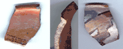 Eckert (2003, 2006) breaks this pottery into two types. She uses "Pottery Mound Polychrome" to describe A rim bowls slipped yellow to buff on the interior surface and red on the exterior surface, and dates the type from AD 1375 to 1450 or later. She uses "Hidden Mountain Polychrome" for A or C rim bowls are slipped red on the interior surface and white on the exterior surface, and dates the type from AD 1400 to 1450 or later. By her standards, the bowl sherd with a C rim shown here is Hidden Mountain Polychrome, not Pottery Mound Polychrome.