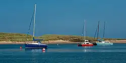On the north bank below the weir is a cave hermitage, which dates from the 14th and early 15th centuries. It was abandoned by 1567, but remains one of the best preserved and elaborate monuments of its type in the British Isles, and is a grade I listed structure.[39] On the tidal section, a loop to the north encloses the centre of Warkworth, including its medieval castle and church.[3] Below Warkworth is Amble half-tide weir, which maintains water levels through Warkworth when the tide is low, but is submerged at high tide. It has a central notch and a fish pass near the southern bank. In 2018, the flow through the notch was decreased, and that down the fish pass increased, as fish tended to use the notch, where they were caught in large numbers by seals.[40] Below the weir the channel widens to form Warkworth Harbour, with the town of Amble on the south bank. There is a marina and a Royal National Lifeboat Institution lifeboat station, which houses two lifeboats, a Shannon-class all-weather boat propelled by water jets, and a D-class inflatable boat for inshore work. The crew have received 18 awards for gallantry between them, including the first ever awarded for a rescue by an inshore boat.[41] Finally the river enters the North Sea, almost opposite Coquet Island, located 1 mile (1.6 km) out to sea.[3]