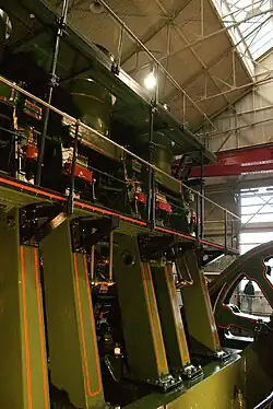 The River Don Engine is a 1904-built steam engine used for hot rolling steel armour plate.[1] It is a 3-cylinder simple engine of 40 inches (1.0 m) diameter, 48 inches (1.2 m) stroke. At its operating steam pressure of 160psi, it developed 12,000 horsepower (8.9 MW), and was able to reverse from full speed in 2 seconds. The rapid reverse was an essential feature of an engine used for rolling, as delays would result in cooling of the workpiece. This engine was one of four built to the same design, one going overseas to the Japanese Government, one to John Brown's Atlas plant, one to William Beardmore of Glasgow and one which stayed in Sheffield at Cammell's mill. It is claimed to be one of the most powerful steam engines ever built, and the most powerful remaining in Europe.[2]