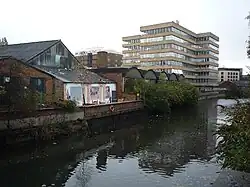 The River Foss at York, looking upstream. The bridge is the Foss Bridge (1811–12), which links the streets of Fossgate and Walmgate.