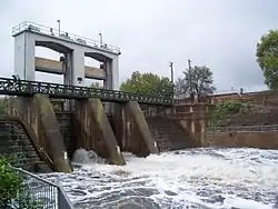 In 1867, prison labour from nearby Adelaide Gaol was used to build a wooden dam near the site of the current weir. The dam was poorly constructed and almost immediately the Torrens washed it away. Construction of a permanent concrete weir was begun in November 1880 and completed, at a cost of £7,000, in 1881. The sluice gates were closed to begin filling the 12-hectare (30-acre) Torrens Lake on 1 July 1881. At the lake's official opening on 21 July 1881 an estimated 40,000, almost the entire population of Adelaide, attended. During the 1889 flood, the weir was overwhelmed, its gates jammed, and in trying to free them the weir's designer John Langdon was crippled.[42] The weir was rebuilt from 1928 to 1929 with its footbridge relocated and the centre section replaced. The gates can now be fully raised and the river allowed to flow unimpeded.[56]