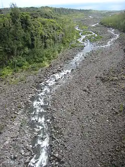 The Rivière de l'Est flows down the slopes of the shield volcano Piton de la Fournaise from an elevation of 720 metres (2,350 ft) above sea level.