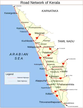 Kerala has 331,904 kilometres (206,236 mi) of roads, which accounts for 5.6% of India's total.[1][2] This translates to about 9.94 kilometres (6.18 mi) of road per thousand people, compared to an average of 4.87 kilometres (3.03 mi) in the country.[1][2] Roads in Kerala include 1,812 kilometres (1,126 mi) of national highway; 1.6% of the nation's total, 4,342 kilometres (2,698 mi) of state highway; 2.5% of the nation's total, 27,470 kilometres (17,070 mi) of district roads; 4.7% of the nation's total, 33,201 kilometres (20,630 mi) of urban (municipal) roads; 6.3% of the nation's total, and 158,775 kilometres (98,658 mi) of rural roads; 3.8% of the nation's total.[3] Most of Kerala's west coast is accessible through the NH 66 (previously NH 17 and 47); and the eastern side is accessible through state highways.[4] New projects for hill and coastal highways were recently announced under KIIFB.[5] National Highway 66, with the longest stretch of road (1,622 kilometres (1,008 mi)) connects Kanyakumari to Mumbai; it enters Kerala via Talapady in Kasargod and passes through Kannur, Kozhikode, Malappuram, Guruvayur, Kochi, Alappuzha, Kayamkulam, Kollam, Thiruvananthapuram before entering Tamil Nadu.[4] Palakkad district is generally referred to as the Gateway of Kerala, due to the presence of the Palakkad Gap in the Western Ghats, through which the northern (Malabar) and southern (Travancore) parts of Kerala are connected to the rest of India via road and rail. The state's largest checkpoint, Walayar, is on NH 544, in the border town between Kerala and Tamil Nadu, through which a large amount of public and commercial transportation reaches the northern and central districts of Kerala.[6] Kottayam has the maximum length of roads among the districts of Kerala, while Wayanad accounts for minimum.[7]