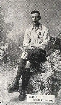 He was selected to play in goal for England's first ever international match against Scotland on 30 November 1872. The original selection for goalkeeper, Alexander Morten, was unavailable and, according to Graham Betts in "England – Player by player", "Barker was chosen (to play in goal) because he was the biggest and slowest player in the England team and because his rugby experience and handling of the ball would come in useful"[2] Barker kept a clean sheet for the first half and at some point in the game he switched places with William Maynard.[3] At 25 years, 165 days Barker was the oldest player in the England line-up.