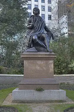 The memorial sculpture in Manhattan's Central Park was cast c. 1880 and dedicated on 2 October 1880.[1][2] It was the first statue of Burns to be erected outside Scotland and was a gift to the City of New York from Saint Andrew's Society of the State of New York and the Scottish-American community. For this sculpture Steell closely followed the portrait of Burns painted by Alexander Nasmyth in 1787. Seated on a tree stump with a quill pen in one hand, Burns looks up to heaven. He is thinking of his true love Mary Campbell, who died at an early age. It was to her that he had written the poem "To Mary in Heaven" inscribed on the scroll at his feet.
