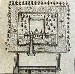 Lindley Hall, the Burton family manor, as depicted in a stylised frontispiece to William Burton's Description of Leicestershire (1622). The manor was a medieval foundation, inherited affinially by the Burton family, and torn down in the 17th century.[2]