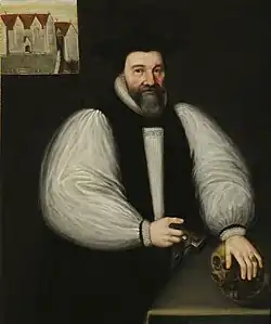 John Bancroft, Burton's tutor at Christ Church, and a lifelong friend. In the left corner is a view of Bancroft's palace near Oxford, Cuddesdon, which Burton praised in the Anatomy, suggesting he was a frequent visitor to his old tutor's estate.[12]