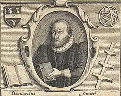 Engraving of Burton, under the name Democritus Junior, in the frontispiece to his Anatomy of Melancholy. This engraving is from the 1628 edition.