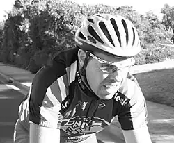 Rob Crowe riding in the TAC VicRoads 2003 road-safety ambassador cycling kit with 'hazard striping'