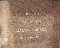 Moses was of Jewish origin and raised in a secularist manner inspired by the Ethical Culture movement of the late 19th century. He was a convert to Christianity[59] and was interred in a crypt in an outdoor community mausoleum in Woodlawn Cemetery in The Bronx, New York City following services at St. Peter's by-the-Sea Episcopal Church in Bay Shore, New York. [60]