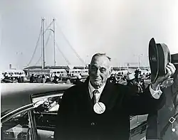 Robert Moses gives a salute after the ribbon-cutting ceremony to open the Verrazzano-Narrows Bridge on November 21, 1964