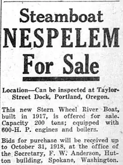 10. ^ a b "Steamboat NESPELEM for Sale". Morning Oregonian (Advertisement). Vol. 58, no. 18, 066. Portland, Oregon. October 18, 1918. p.15, col.7.